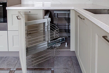 • Выделяемые средства собственника. С учетом этого определяется материал изготовления фасада, стен, пола. От бюджета зависит внешний вид столешницы, сложность ее формы: наличие распашных дверей, выдвижных или выкатных ящиков.