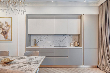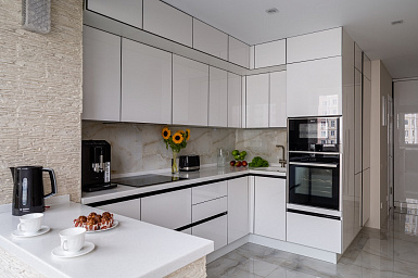 Дизайн-проект отражает конфигурацию кухонного гарнитура. Специалист определяет функциональные точки и рабочую зону так, чтобы эргономические требования к помещению были соблюдены.