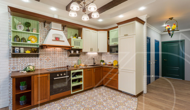 Кухни кантри. Версии в деревенском стиле привлекают большое количество потребителей. Мебель такого типа обладает простыми и четкими формами. В цветовой палитре преобладают природные оттенки – коричневые, фисташковые, бежевые и песочные. Для декоративной отделки применяются деревянные решетки, вставки из стекла, резьба.