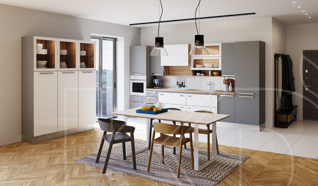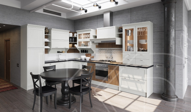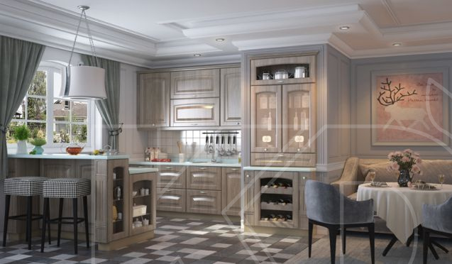 Кухни неоклассика. В моделях неоклассического стиля прослеживается сочетание классической строгости и новаторской функциональности. Подобные версии обычно оснащают большим количеством выдвижных ящиков, секций, открытых и закрытых полок. Декорируют такие гарнитуры небольшими металлическими элементами, стеклянными и зеркальными вставками.