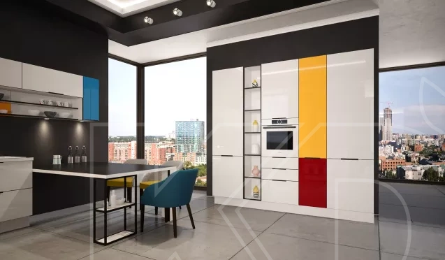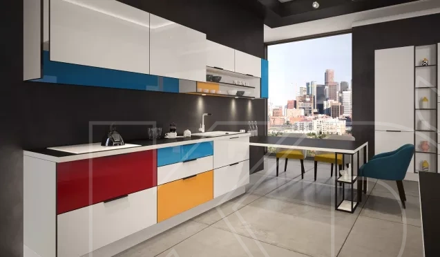 Глянец увеличивает количество света в комнате, отражая солнечные лучи. Благодаря этому помещение выглядит более свободным и просторным. Другое преимущество глянцевых поверхностей – устойчивость к воздействию влаги. К минусам блестящих фасадов можно отнести маркость, так как на них остаются следы от рук. Но при этом легко и быстро отмываются с помощью обычных моющих средств.