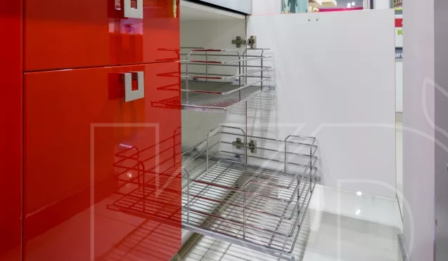 В небольших комнатах используйте алый оттенок точечно. Например, для оформления полок или фартука со столешницей.