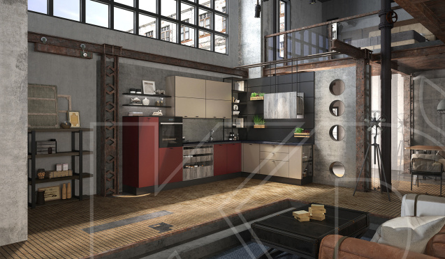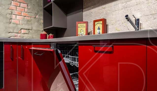 Кухонный гарнитур красный в стиле лофт отличается простотой форм и минимальным декором. При оформлении интерьера с такой мебелью используют кирпичную кладку, стеклянные и металлические элементы.