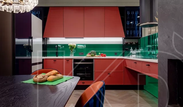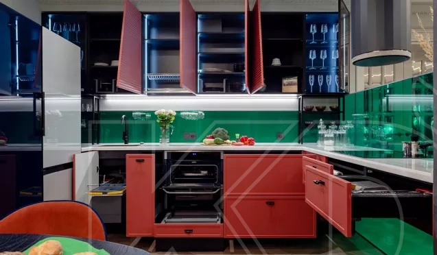 Красная кухня с зелеными вставками выглядит очень эффектно и оригинально. Наиболее выигрышно с зеленым смотрятся темные оттенки красного – вишневый или гранатовый.