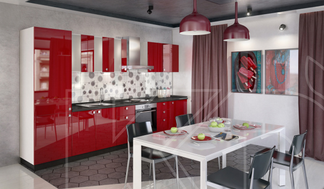 Широкий ассортимент. В алых тонах выпускают кухонные гарнитуры с разной планировкой – угловые, линейные, параллельные, островные и полуостровные.