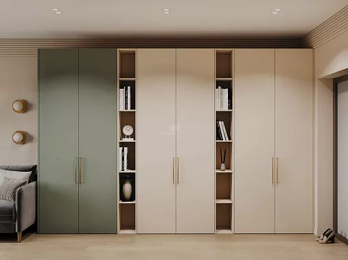 Один из самых универсальных вариантов. Такой блок можно разместить в любой комнате, и он будет выглядеть аккуратно, создавая визуальную геометрию пространства. Когда нужен большой объём хранения и чистые вертикальные линии, шкаф у стены — идеальное решение.