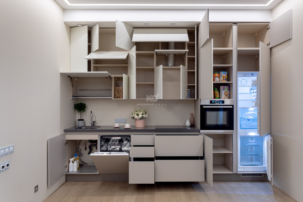 Бонус — к линейной кухне проще подключить коммуникации и нужно меньшее количество материалов для отделки. Это сокращает стоимость ремонта и сильно ускоряет сборку кухни.