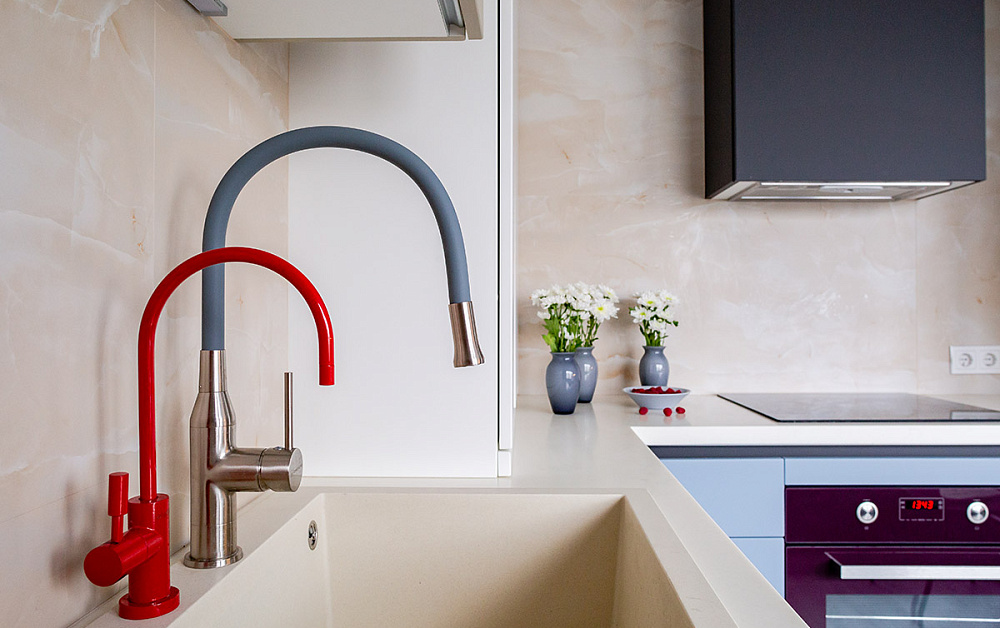 Кухня получилась «воздушной», но, вместе с тем, притягательной. За лёгкость здесь отвечает бархат фасадов и их нежная цветовая палитра. А притягательные акценты умело выставлены с помощью техники! Взгляните, в каких сочных цветах выполнены фильтр для воды, духовой шкаф и миксер! Словно яркие штрихи на монохромном полотне они попадают точно в фокус Вашего внимания. И помогают при этом постичь глубину всей композиции!