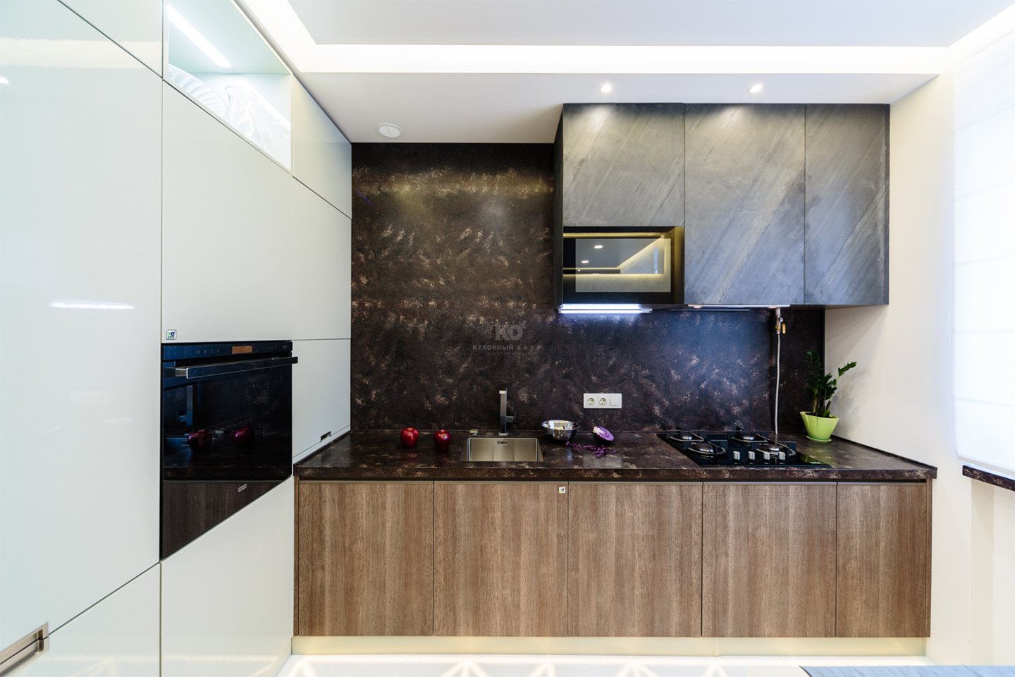Подвесные шкафчики декорированы шпоном сланца, который придает им вид настоящих скал. Еще один декораторский прием в этой игре фактур – крепление шпона: тонкие каменные листы скошены под углом 45 градусов.