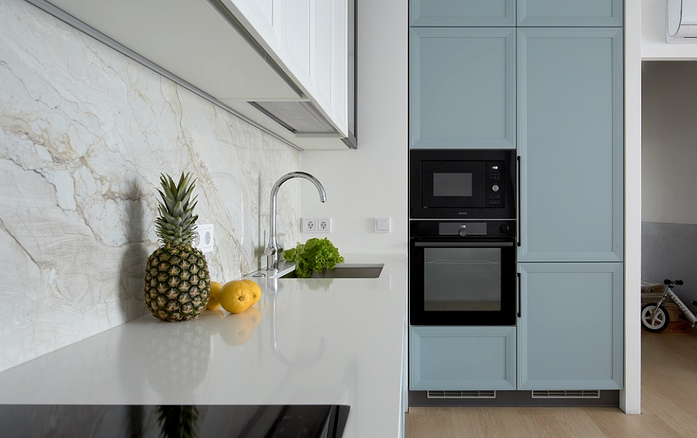 Один из главных – мода на нежное, и вместе с тем, эффектное сочетание оттенков. В этой «Патриции» прекрасно скомбинированы белый и голубой цвета. А подчёркнута эта небесная палитра грамотным добавлением чёрных акцентов. Вы наблюдаете их в технике, а также в алюминиевых рамках застеклённых зон и в ручках-профилях системы открывания «Спейс Лайн». Система «Спейс Лайн, к слову, не только придаёт гарнитуру выразительности, но и визуально «приподнимает» столешницу, делая её изящной и утончённой.